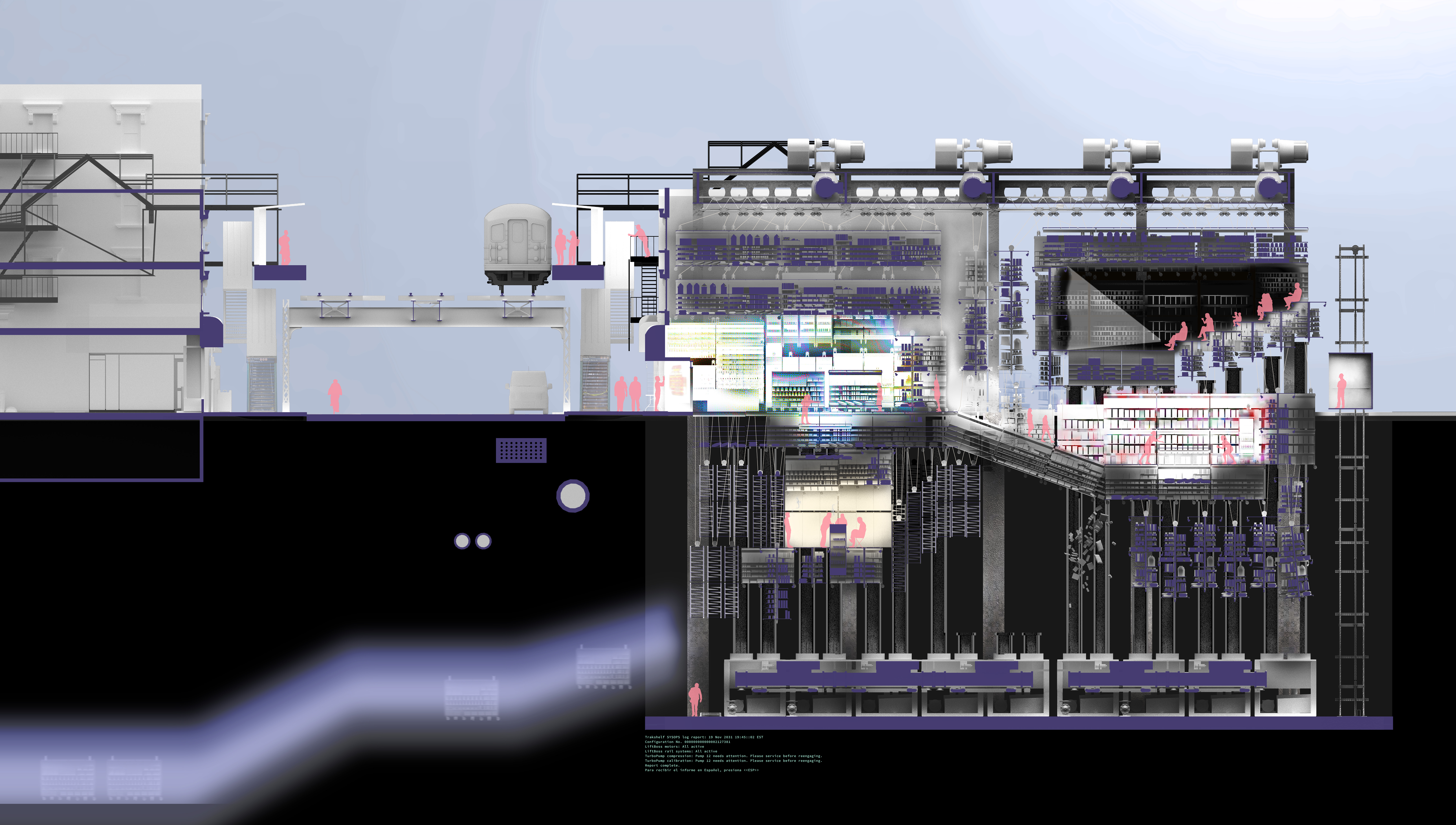 What if bodegas begin to operate with digital corporate logics to subvert those systems and keep Brooklynites coming back to local, immigrant owned businesses? Their stocked-shelf system gets blown up to an unruly proportion, with the walls, floors, and ceiling becoming shelves. An entire building gets bought out, gutted, and infilled with a structural system that reorganizes shelves on the fly. The façade is left standing to mask the full operation, but glimpses can be caught through the windows of the former apartments. The bodega appropriates data-usage models of big tech companies and incorporates them into the physical realm: customers can sign in to the bodega, which then rearranges the shelves based on algorithms, trends, purchase history, and recommendations to best suit and entice the customer. Remote storage logics are reworked and incorporated through an inter-bodega network. Independent stores can send shelves over to each other, making each store seem as though it has everything and never goes out of stock. Right under the noses of CVS and Walgreens.